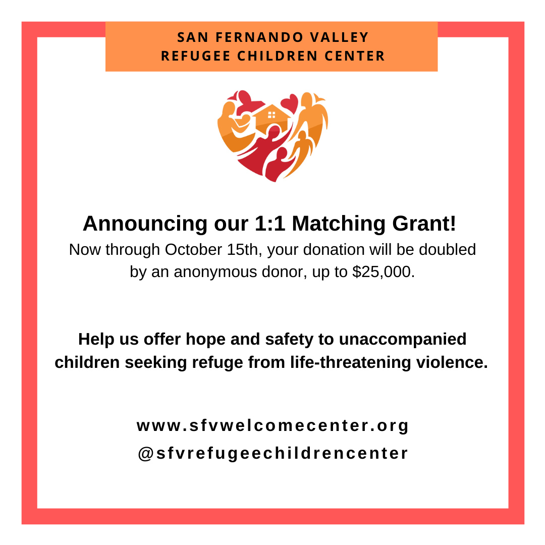 Last month we asked for artists to submit their artwork to be part of this event to support The San Fernando Valley Refugee Children Center's MATCHING GRANT CHALLENGE. See their ask below.